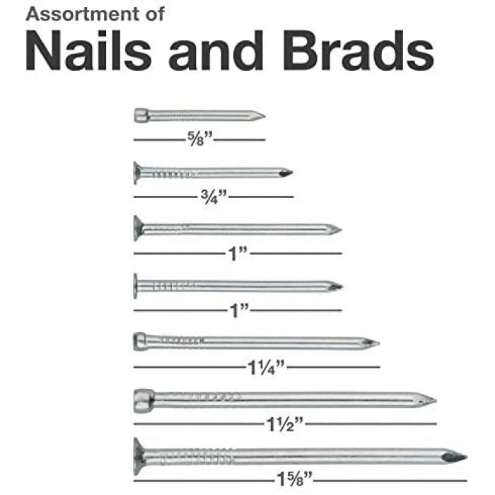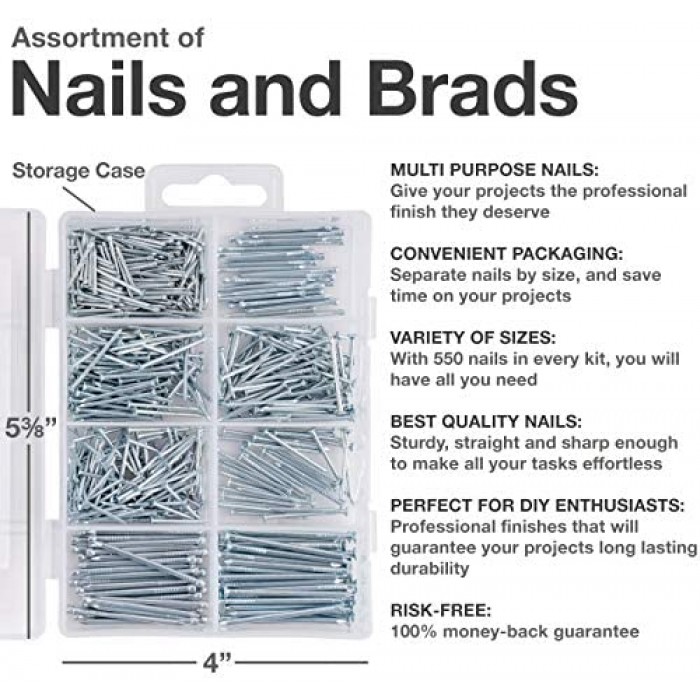 • - VARIETY OF SIZES: The nail set includes nails of many sizes to suit all your woodworking projects and to make your job hassle-free. With 550 nails in every kit, you will have all you need in plenty.