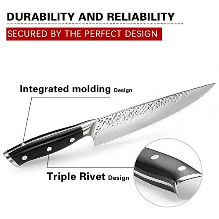 • ?Ergonomic Handle For Comfort? Featuring a triple-rivet handle that is slip-resistant and lends itself to extensive use, optimal knuckle clearance and long hours, our chef's knives helps alleviate accidents while also providing a smooth grip whether you are dicing, chopping, slicing, cutting or mincing food. All of these features result in a balanced, weighted knife that makes food and meal preparation easier and more enjoyable.